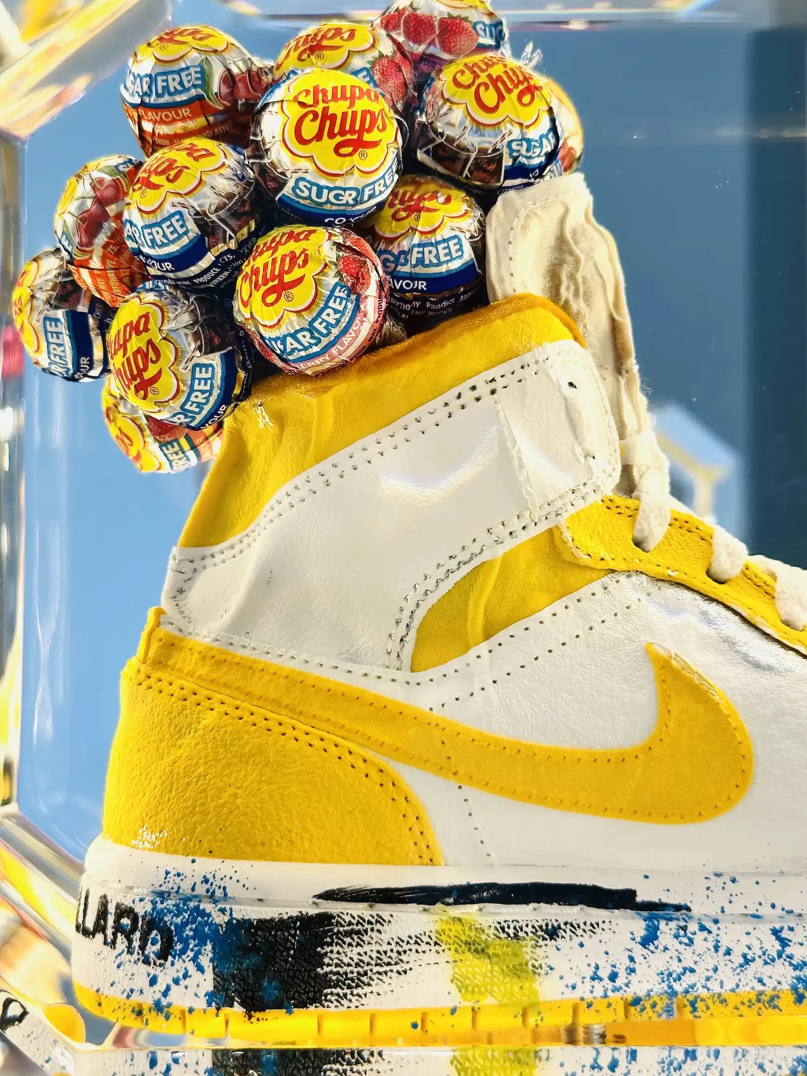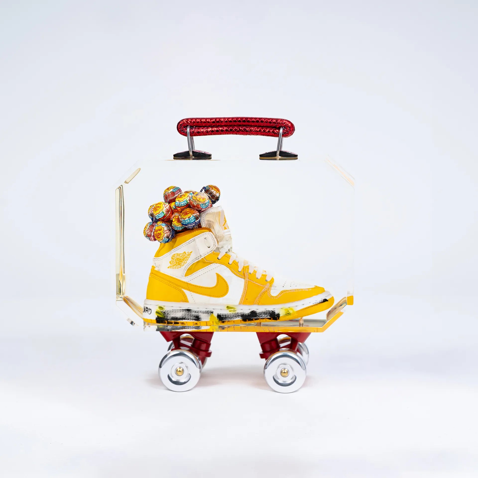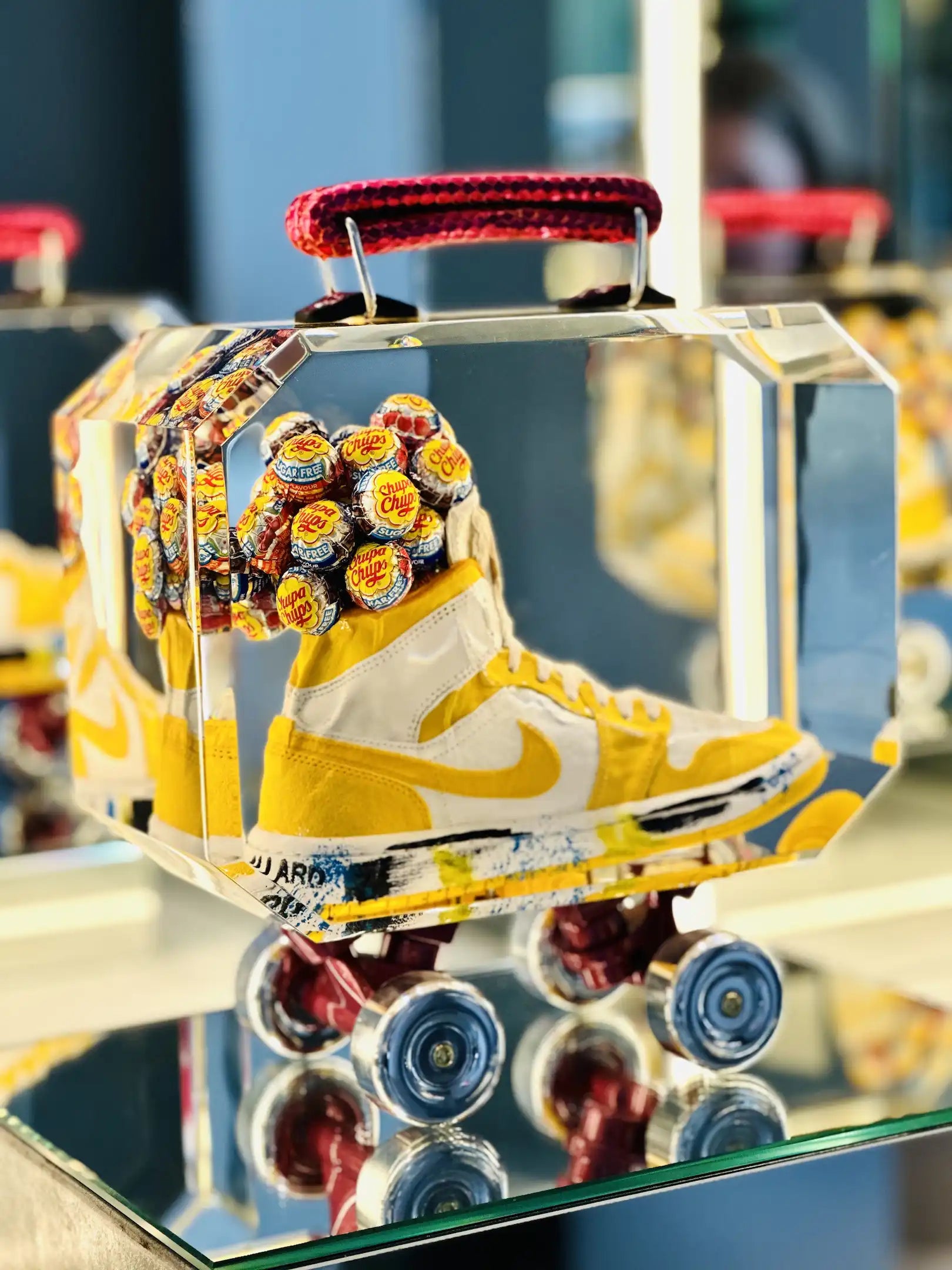 Adventure explose comme un cri pop dans un monde saturé de codes. Le jaune fluo électrise la pièce, tandis que des Chupa Chups, symboles d’innocence détournée, s’y mêlent avec irrévérence. Le sac, figé dans une matière brillante, devient totem d’un luxe décalé, d’une gourmandise assumée. Fred Allard détourne ici les rôles, brouille les genres et célèbre l’enfant terrible qui sommeille dans chaque icône. Une pièce insolente, acidulée, qui oscille entre nostalgie et provocation.