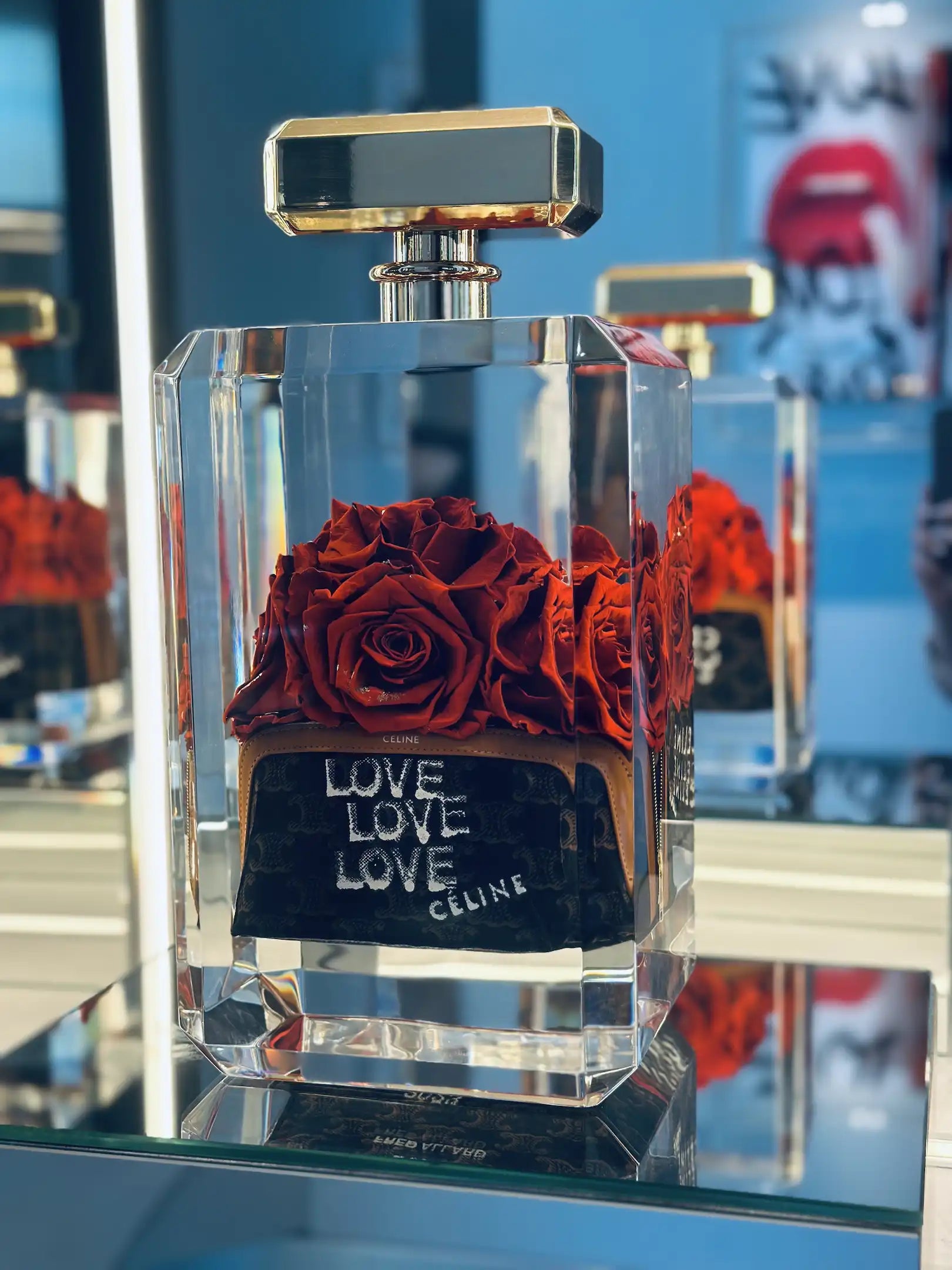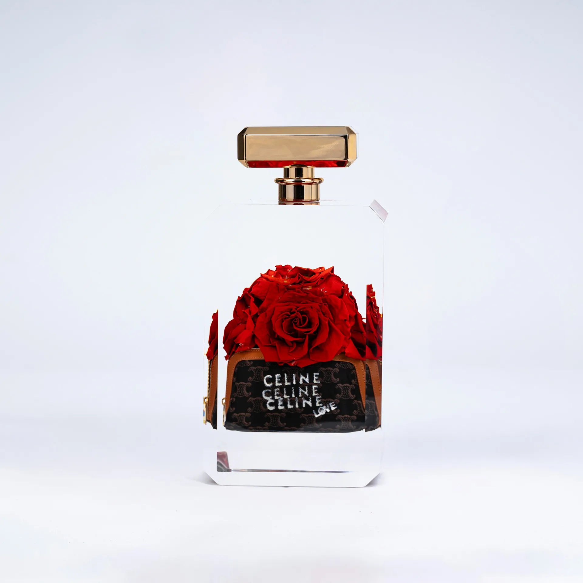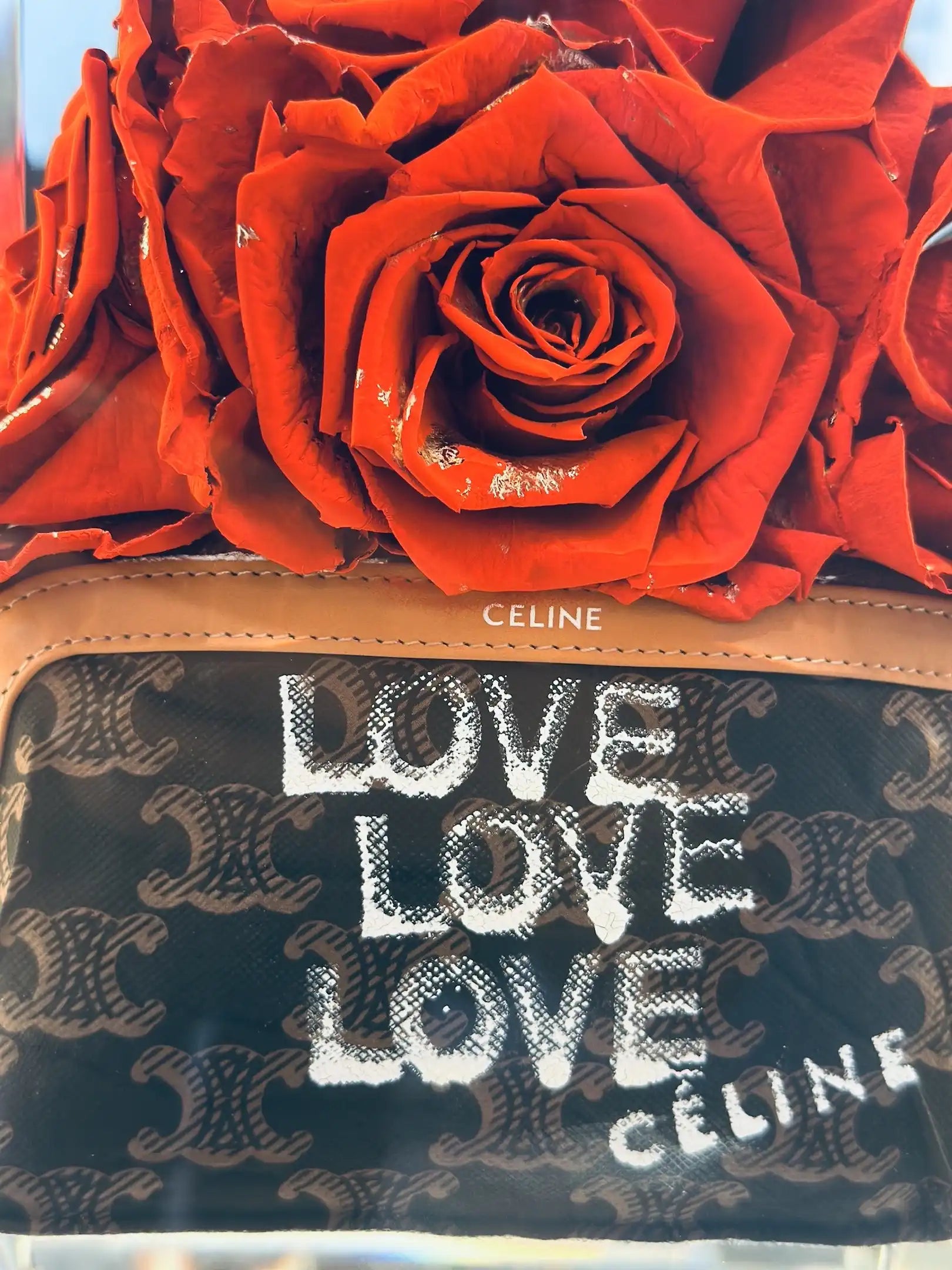 Éclat de rouge et cri du cœur, ce sac Céline authentique se fait manifeste. De vraies roses rouges, la passion à vif, et un mot : LOVE. Un geste fort, signé Fred Allard, où l'amour s'affiche sans filtre, entre luxe et intensité brute.