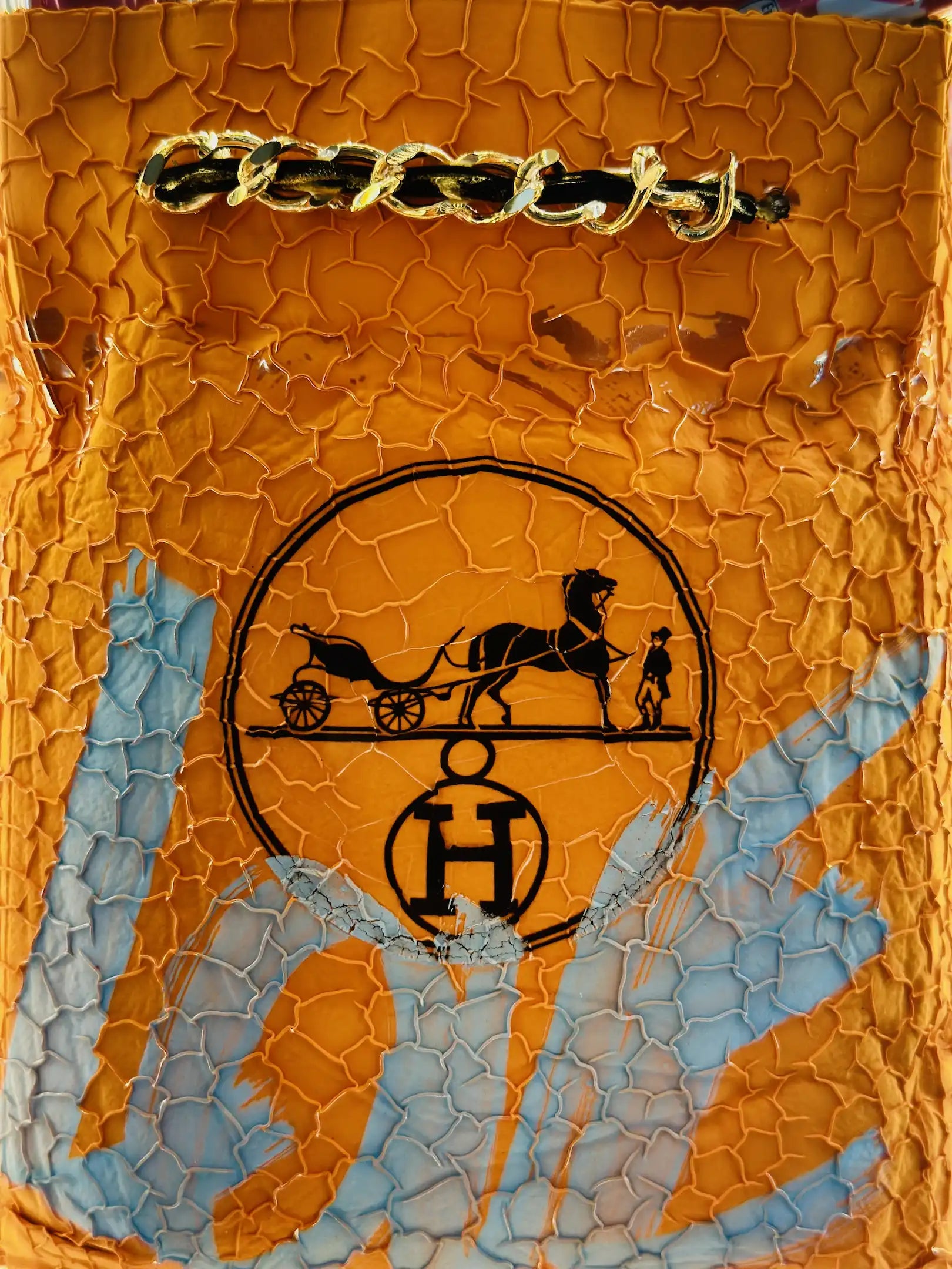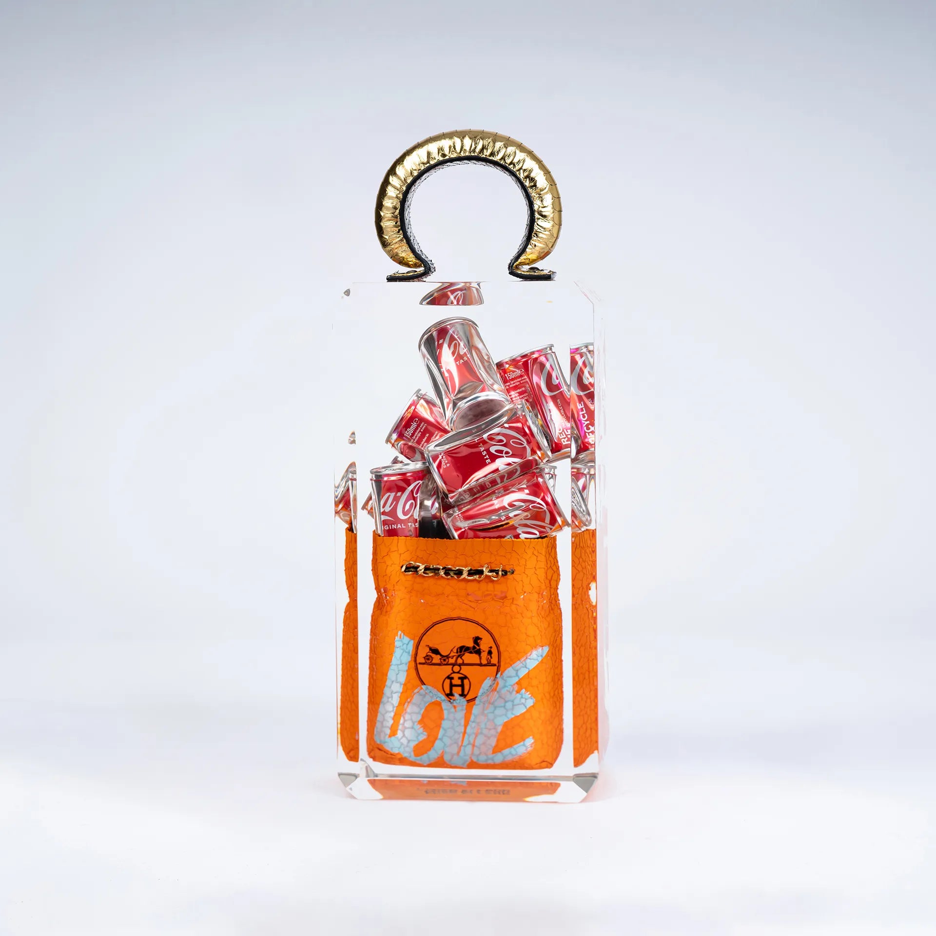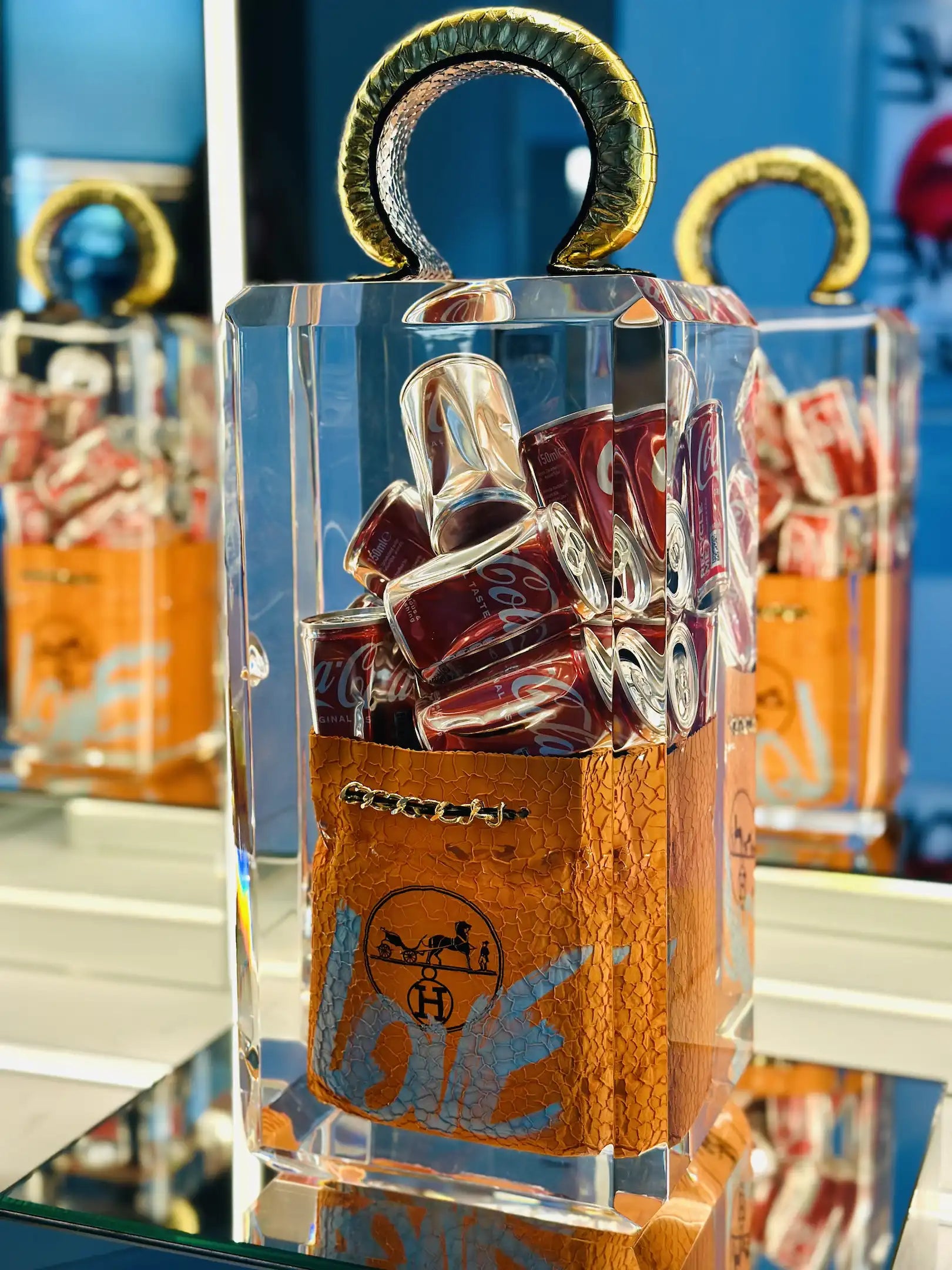 Temps Calme est une collision frontale entre l’ultra-luxe et l’ultra-pop. Dans le bloc de matière, le sac Hermès iconique se remplit de canettes de Coca-Cola écrasées, clin d’œil direct à la culture de masse. Le tag de peinture vient bousculer l’élégance orange du sac, comme un tag sur un mur trop lisse. Une œuvre manifeste, où Fred Allard fusionne luxe et culture populaire avec audace.