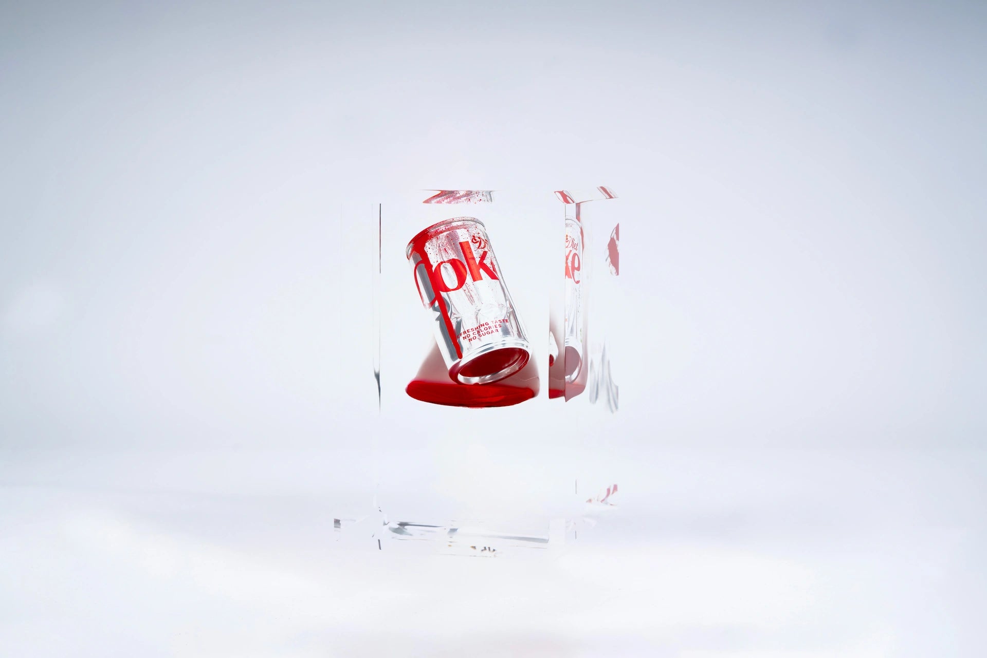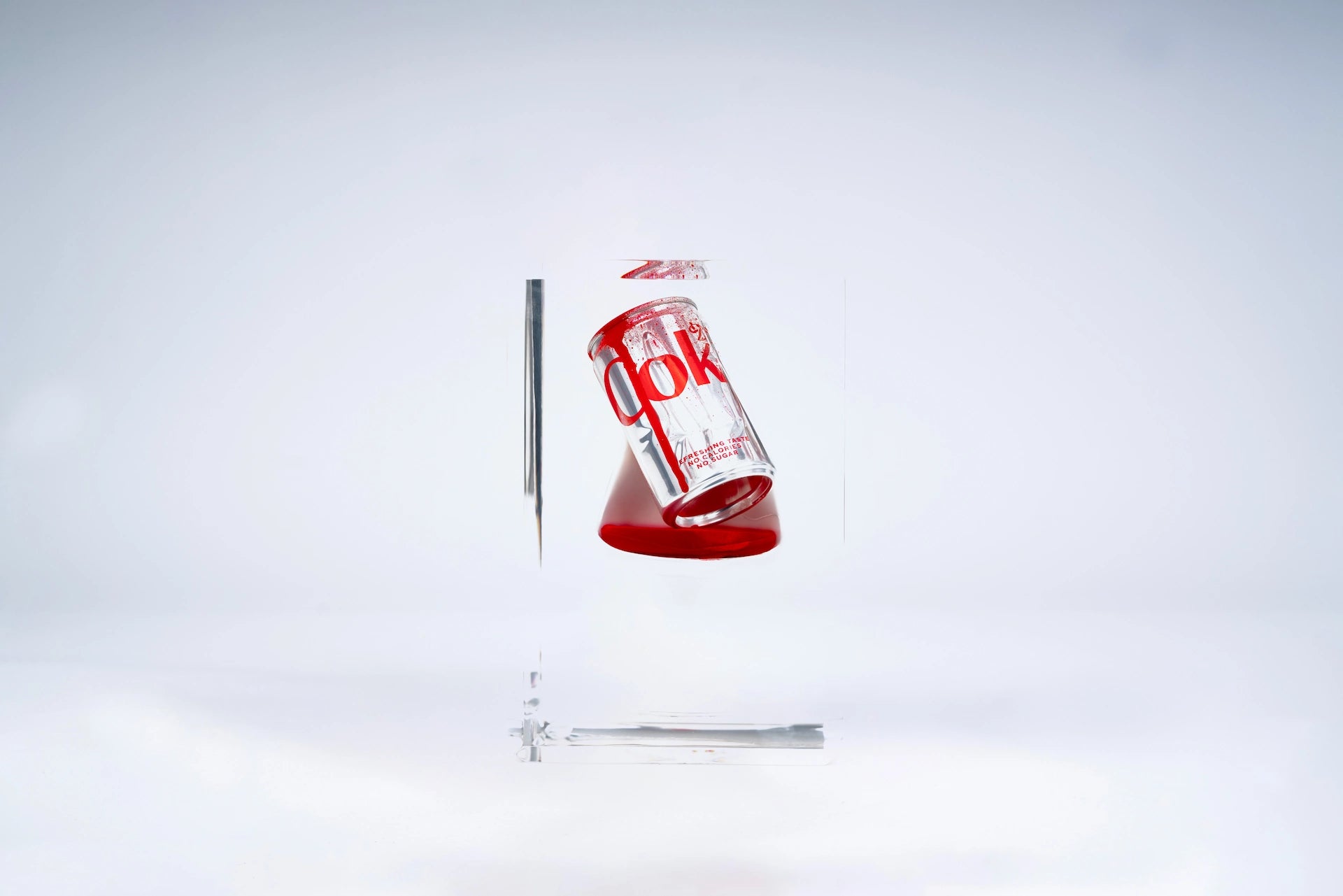 Symbole de pureté et d’équilibre, la chaise dialogue ici avec une canette de Coca-Cola, signature pop de l’artiste.